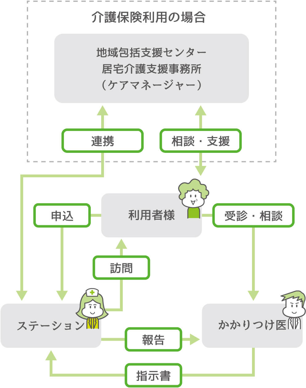 医療保険・介護保険どちらでサービスを受ける場合も、かかりつけ医の「訪問看護指示書」が必要です。